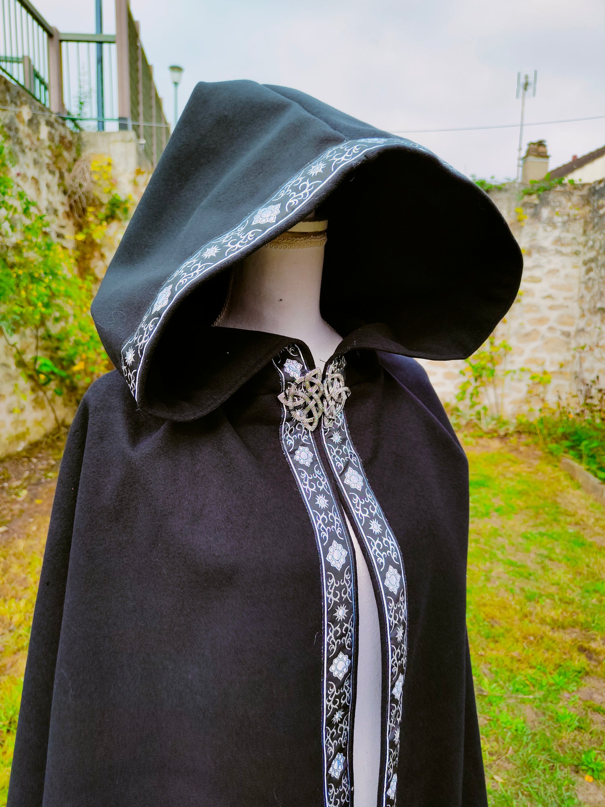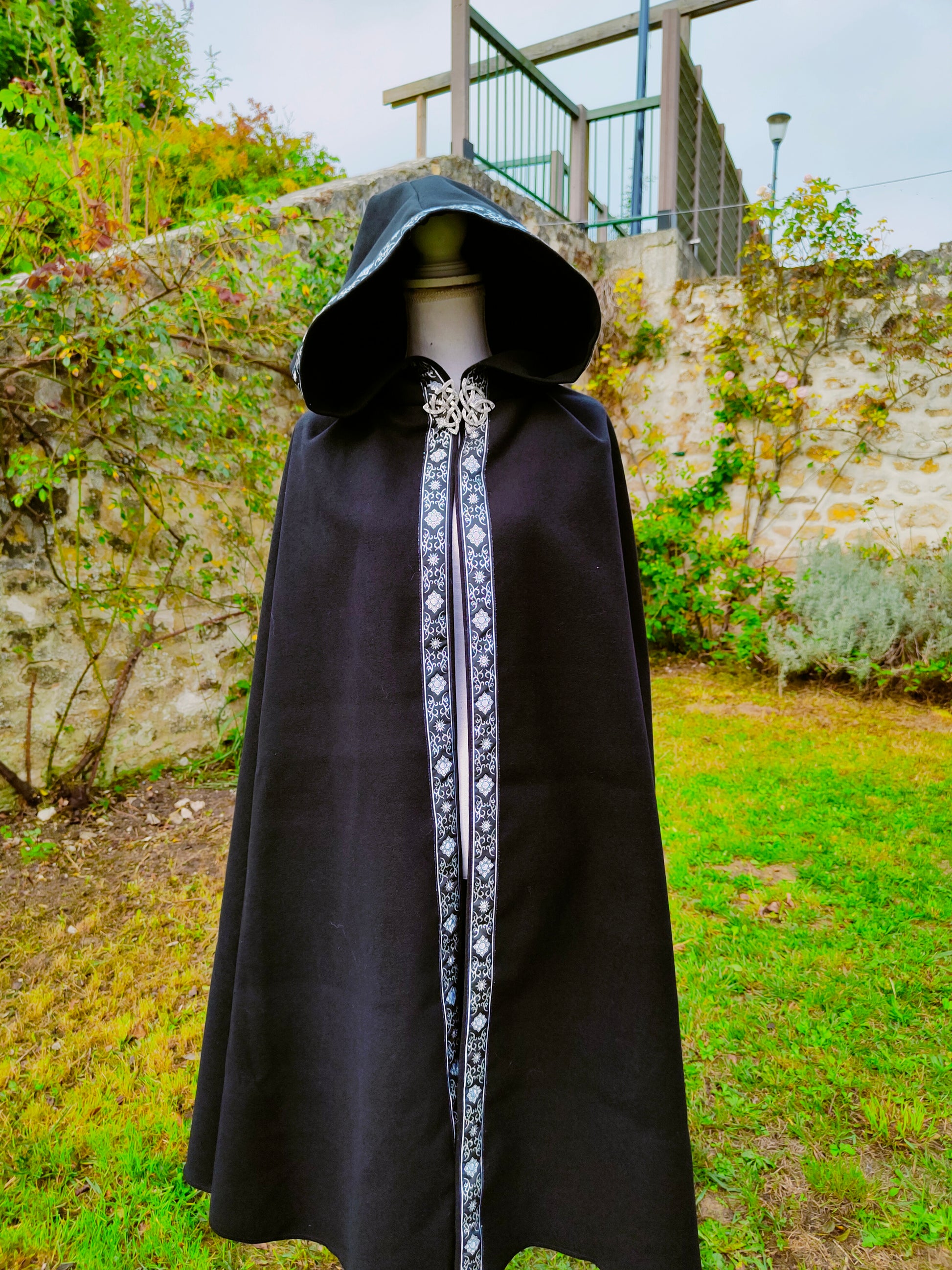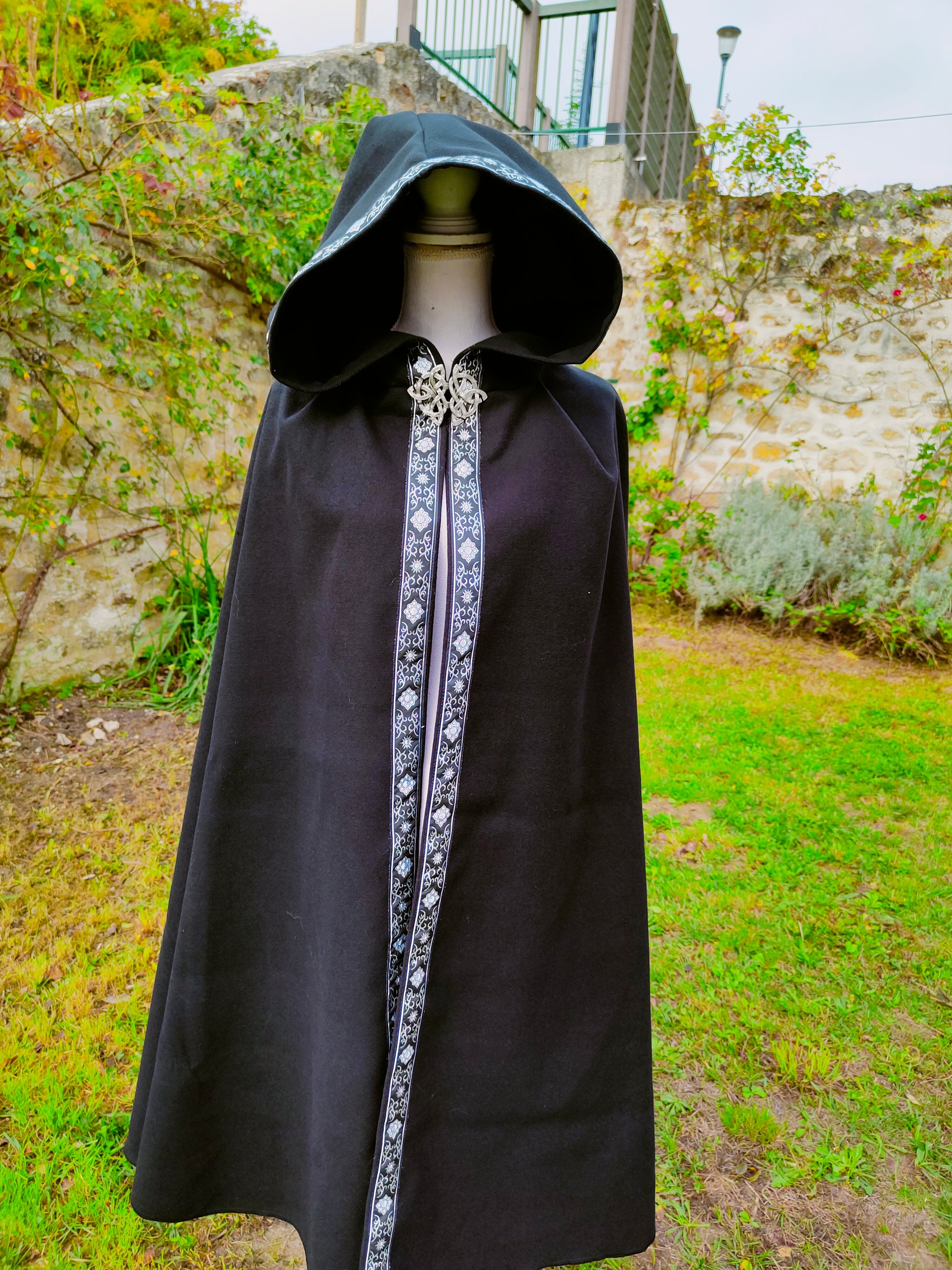 Cette cape médiévale pour homme ou femme en lainage noir, sera votre alliée lors de la froide saison, avec sa grande capuche enveloppante, son beau fermoir et son magnifique galon, vous aurez l'air impressionnant ! elle mesure environ 120 cm de l'épaule jusqu'en bas.
