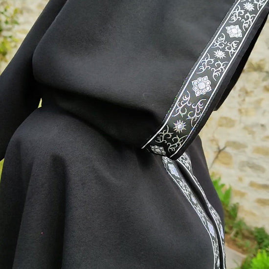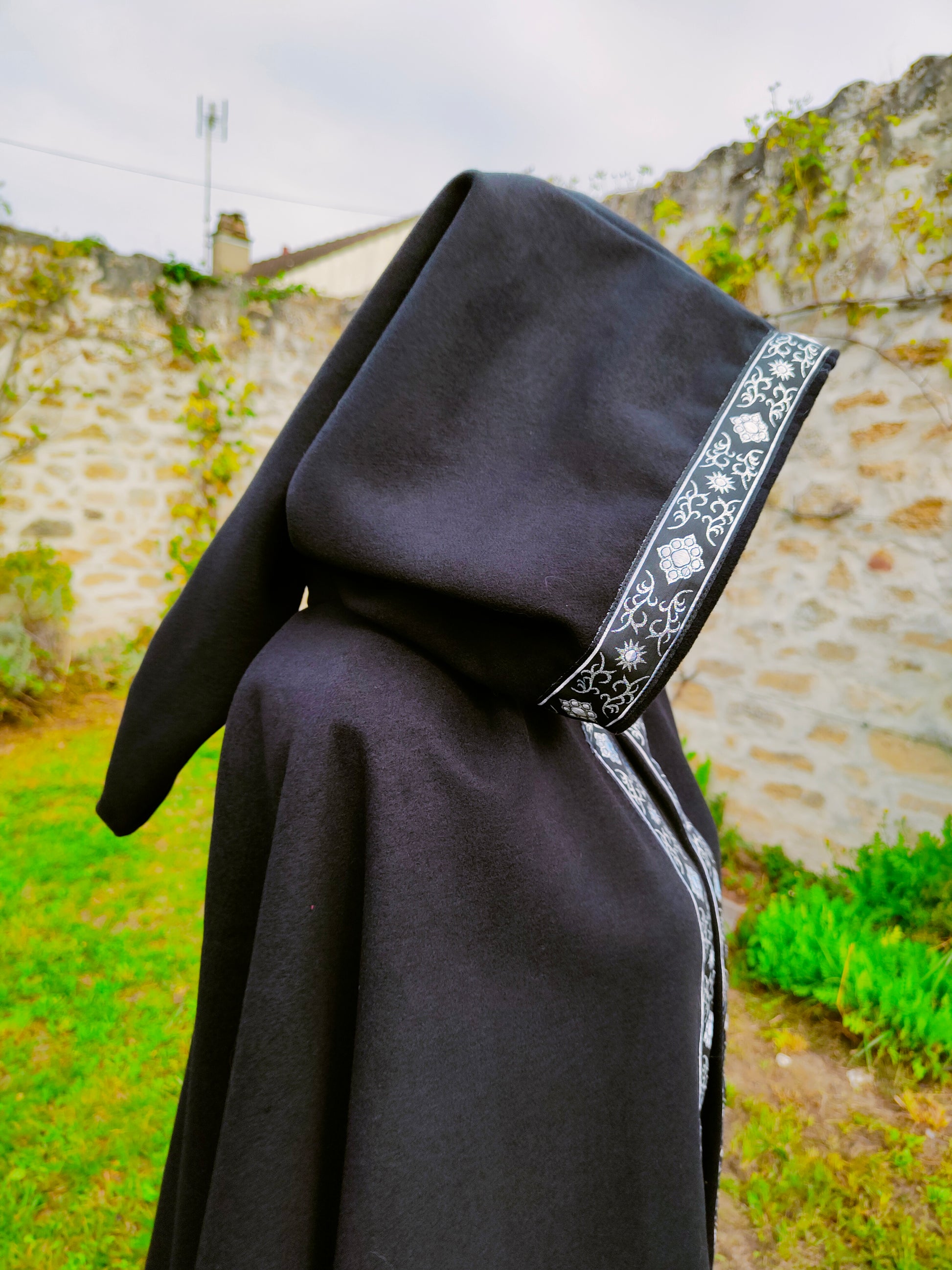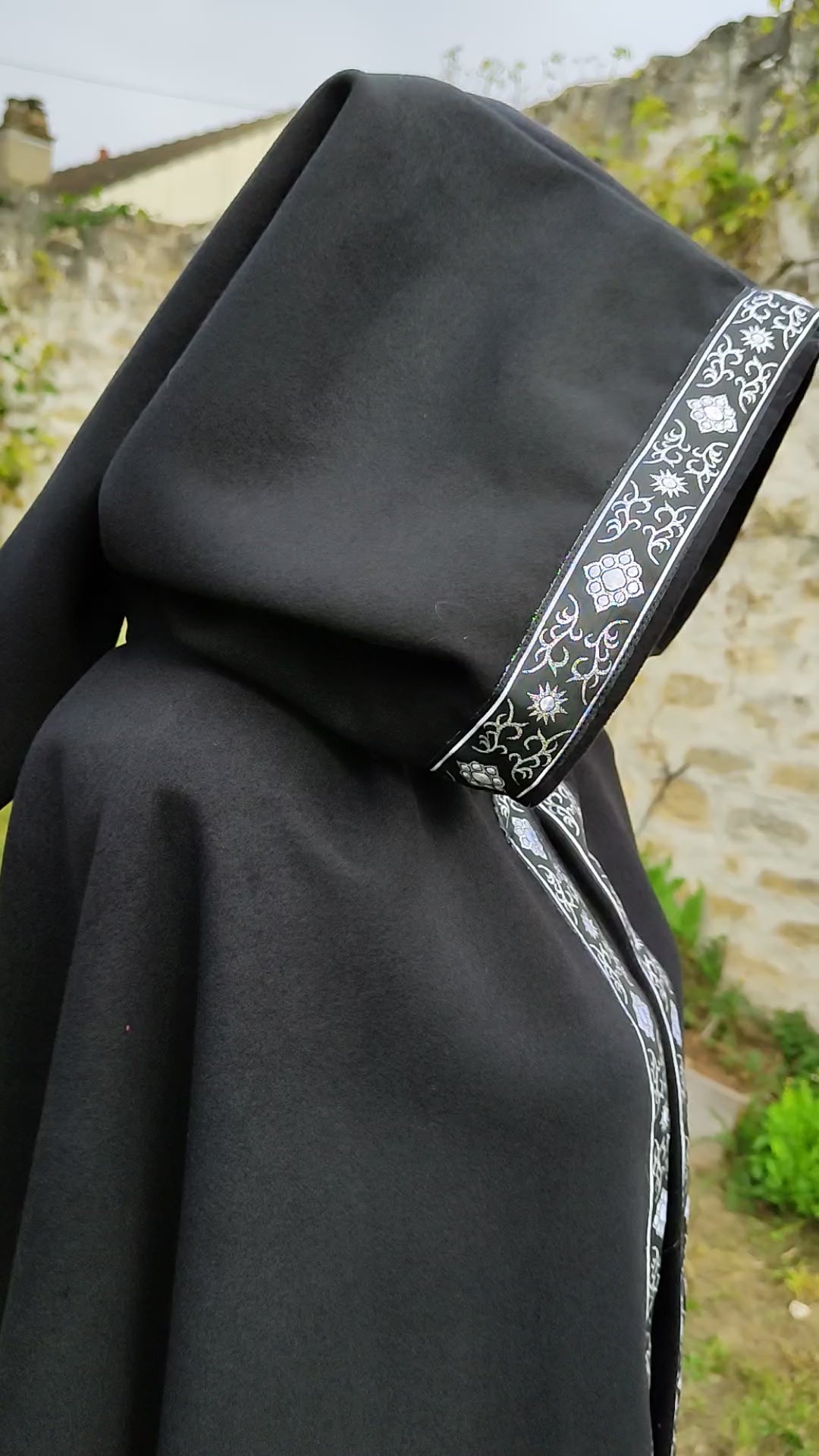 Cette cape médiévale pour homme ou femme en lainage noir, sera votre alliée lors de la froide saison, avec sa grande capuche enveloppante, son beau fermoir et son magnifique galon, vous aurez l'air impressionnant ! elle mesure environ 120 cm de l'épaule jusqu'en bas.
