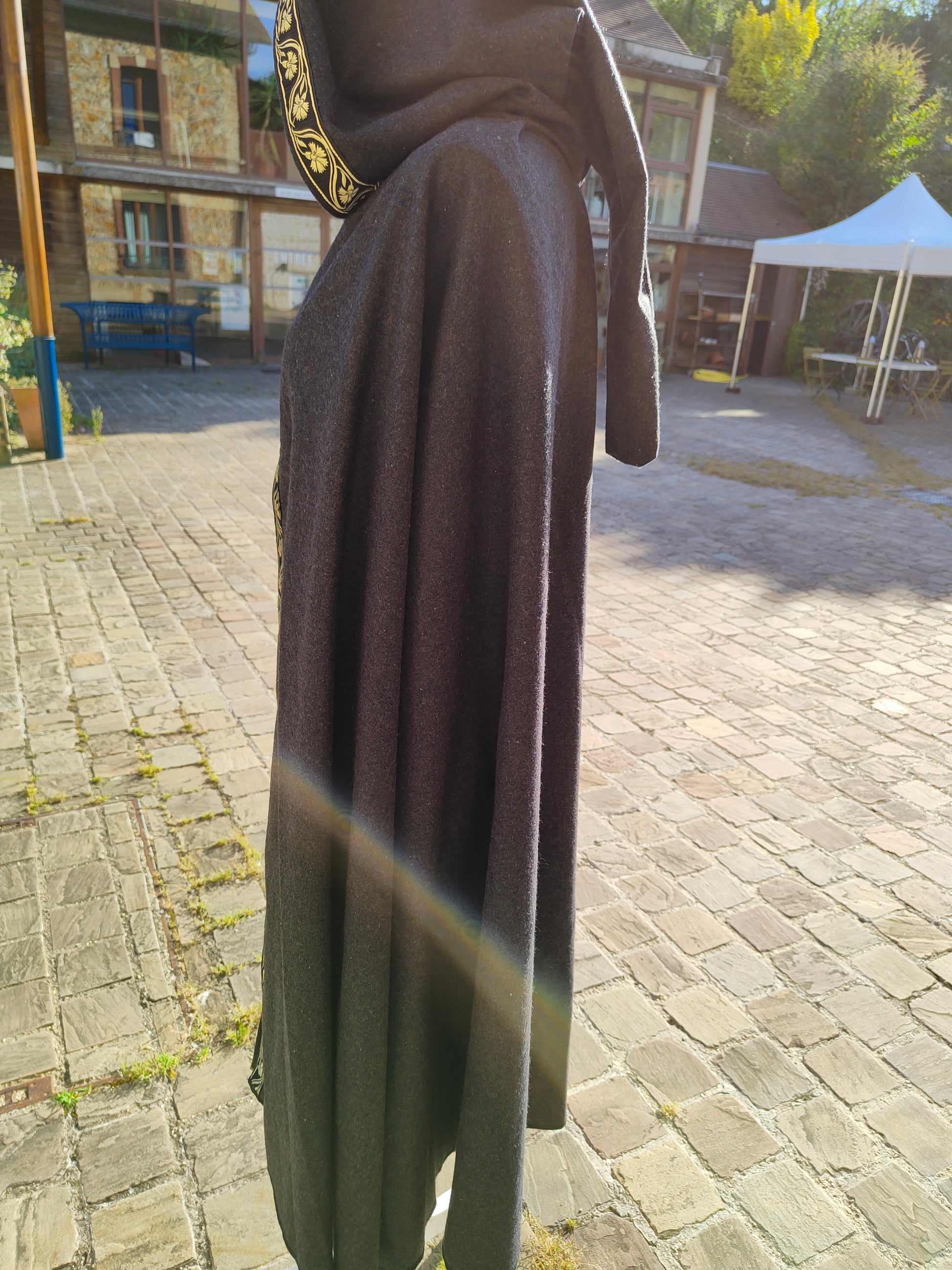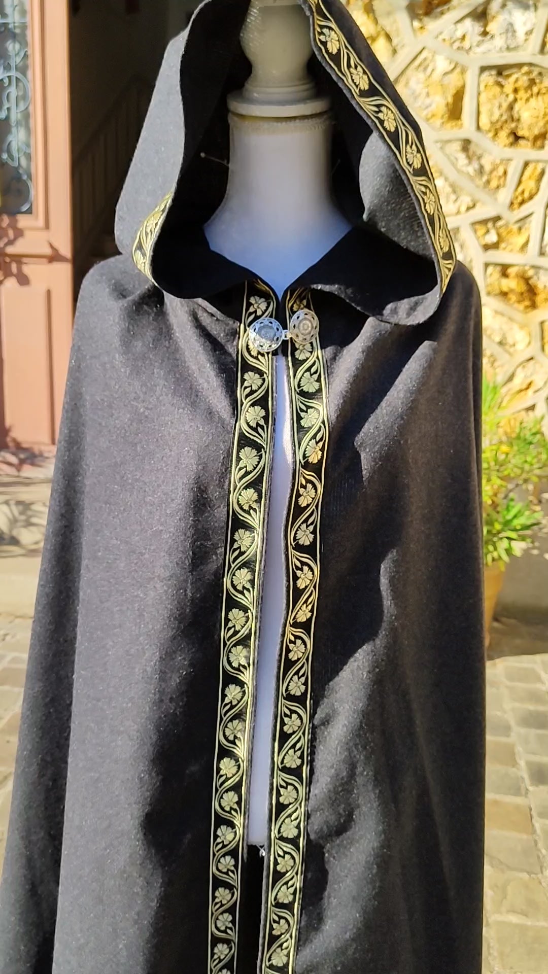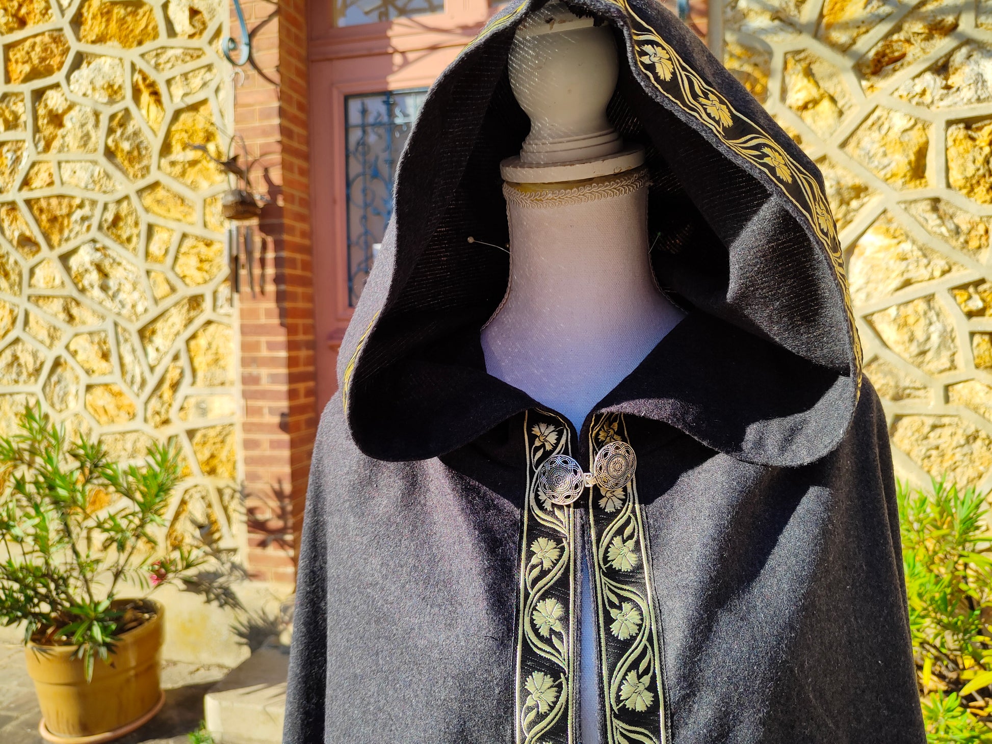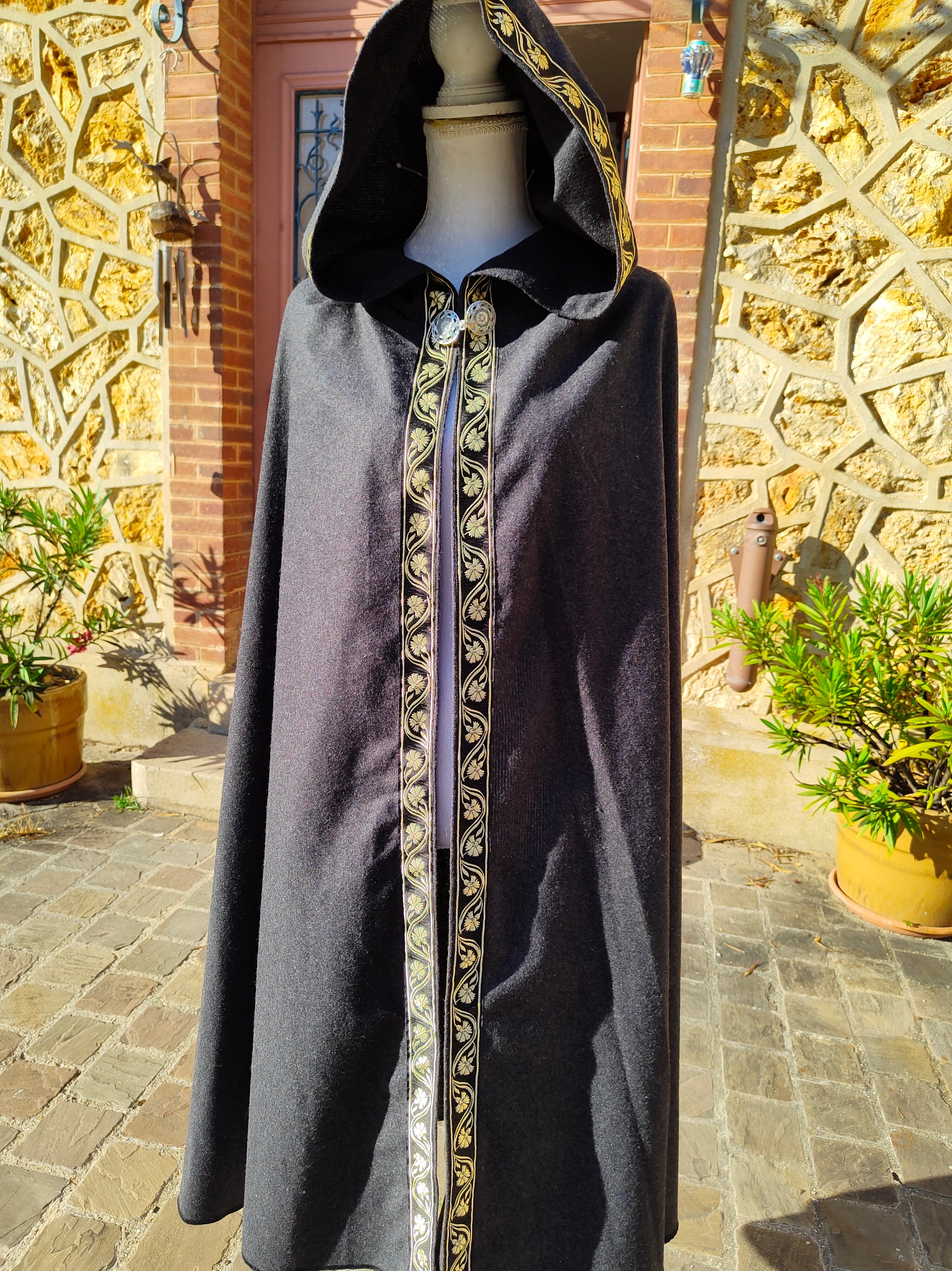 Cape médiévale ou Renaissance gris anthracite en lainage cachemire fin, dotée d'un galon dorée . La capuche longue et pountue est bien enveloppante. Parfaite pour compéter votre costume.
