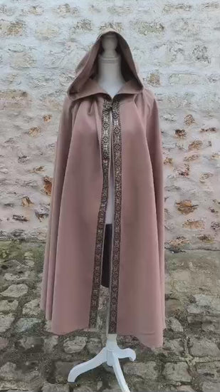 La cape médiévale ou Renaissance et jusqu'au XVIIIe siècle est conçue dans un coloris beige polyvalent, permettant une adaptation à diverses époques. Son élégant galon et son fermoir pratique assurent à la fois style et fonctionnalité. La grande capuche offre une protection supplémentaire, favorisant ainsi le confort lors d'événements costumés.