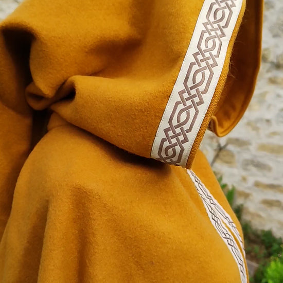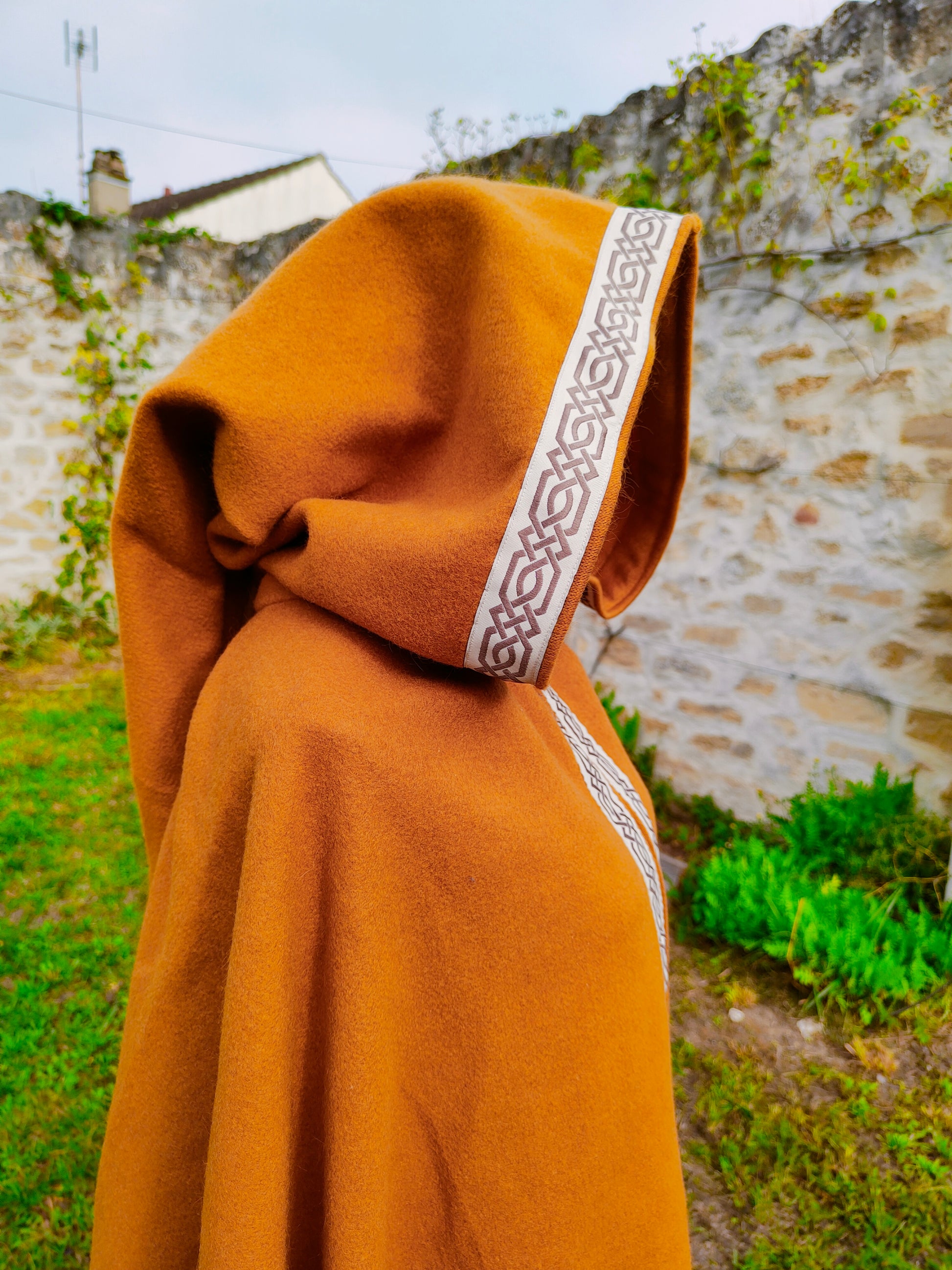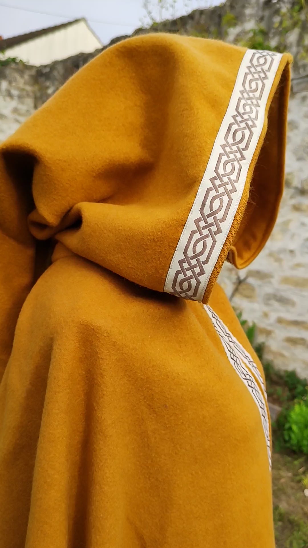 Cette cape médiévale ou viking sera une pièce importante de votre costume. En lainage ocre très chaud, avec grande capuche enveloppante et un magnifique galon, elle mesure environ 120 cm de l'épaule jusqu'en bas. Vous ne passerez pas inaperçu !