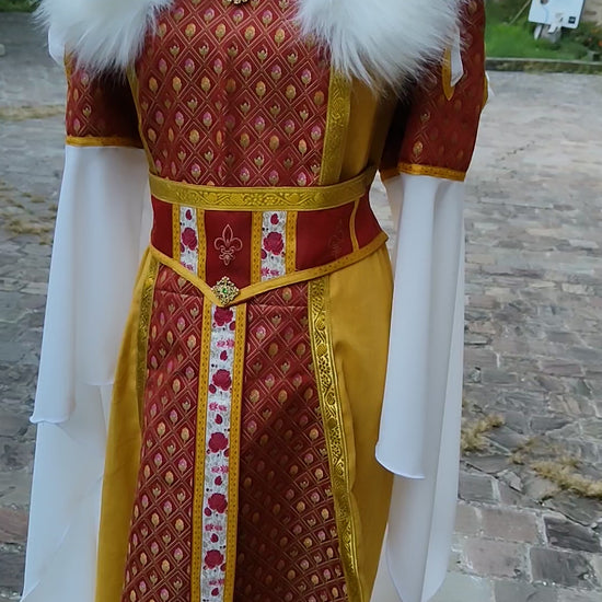 Robe médiévale ou Renaissance avec fausse fourrure amovible, en lin ocre et jacquard rouge et doré.