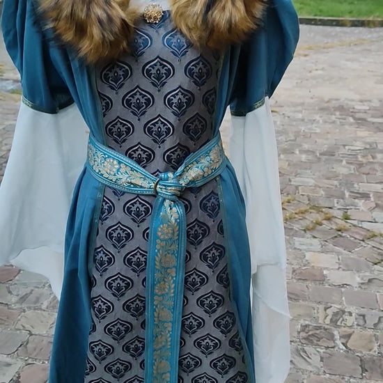 Robe Renaissance ou médiévale pour femme avec fausse fourrure amovible, jacquard à motifs bleus.