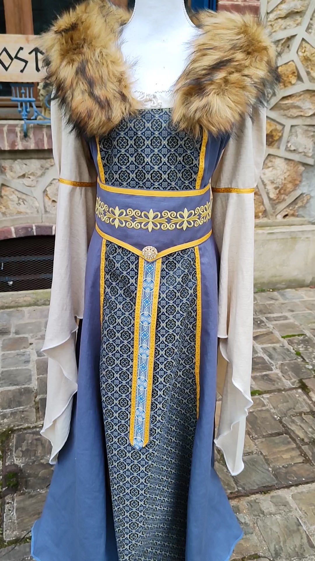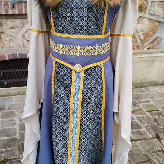 Donnez vie à votre personnage médiéval ou Renaissance avec cette magnifique robe en lin et jacquard bleu à motif médaillons. Les grandes manches et la fausse-fourrure amovible ajoutent une touche de noblesse et de chaleur à votre robe. La magnifique ceinture est fournie et complétera parfaitement votre tenue ( le motif de la ceinture peut varier en fonction du stock.)