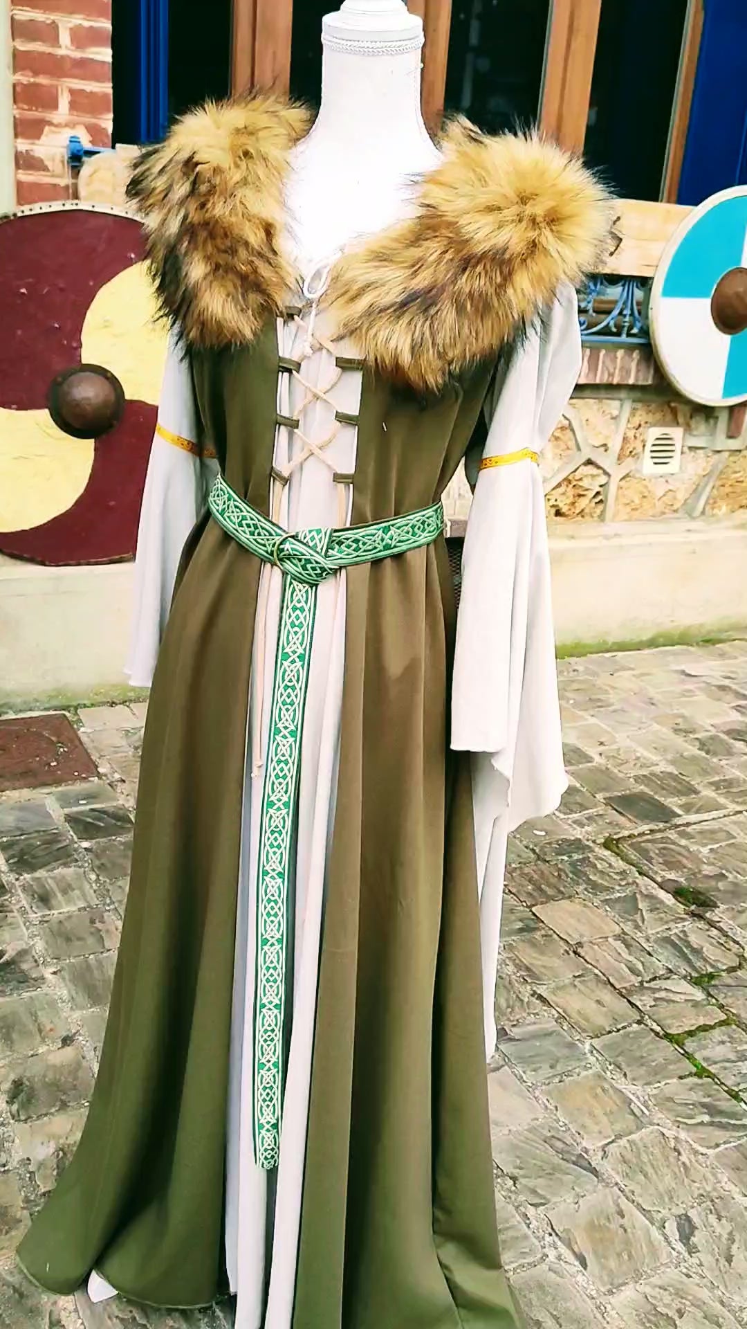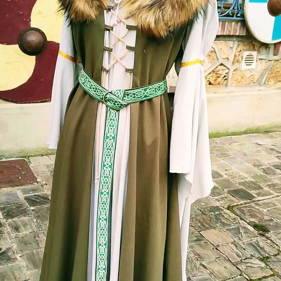 Découvrez cette robe médiévale, celtique ou elfique, conçue en lin et coton. La fausse fourrure amovible vous permet d'adapter votre tenue selon les saisons. Son laçage devant et au dos assure un ajustement optimal de la taille 38 au 46/48, tandis que la ceinture ornée de motifs celtiques ajoute une touche d'élégance.