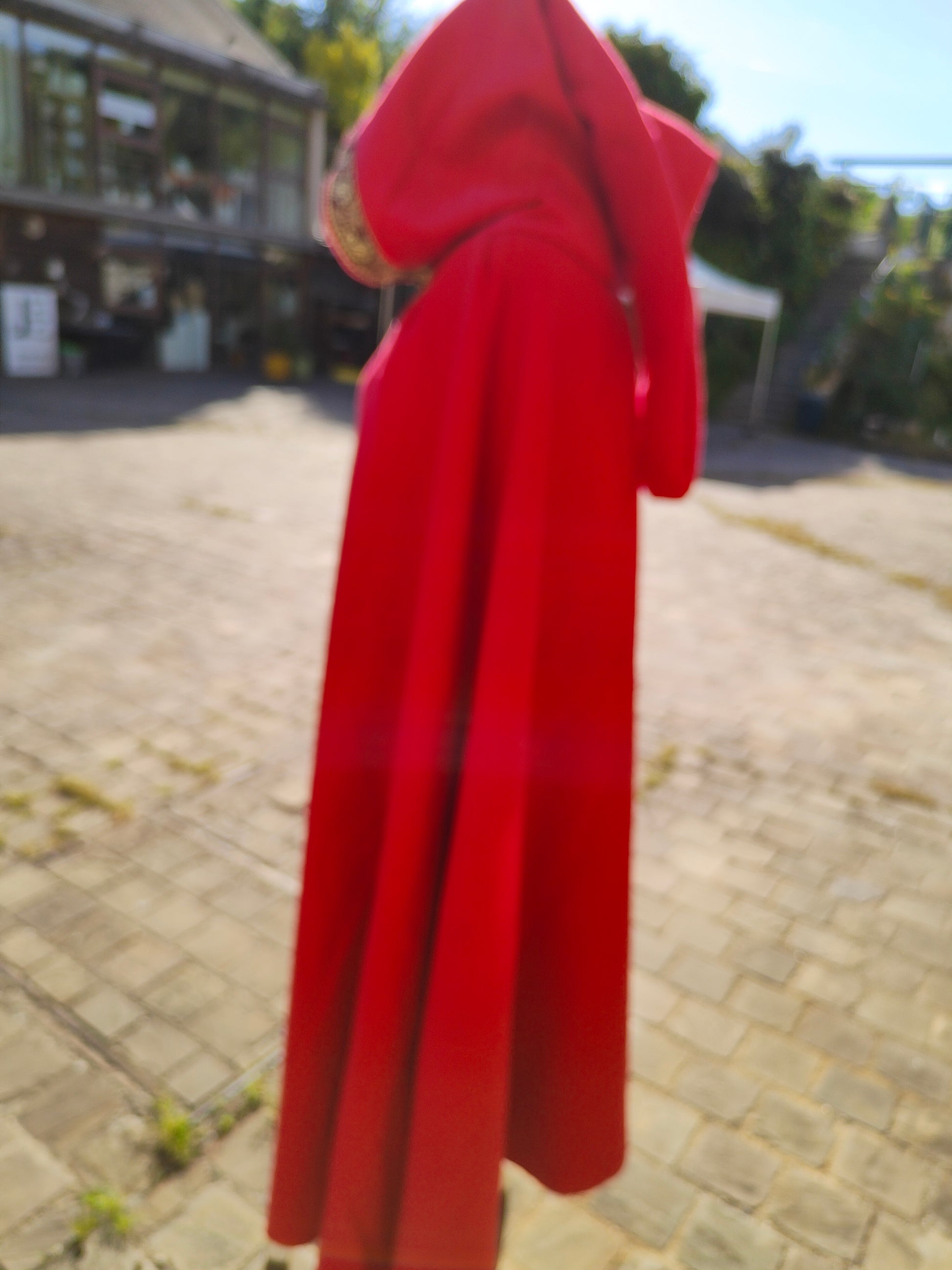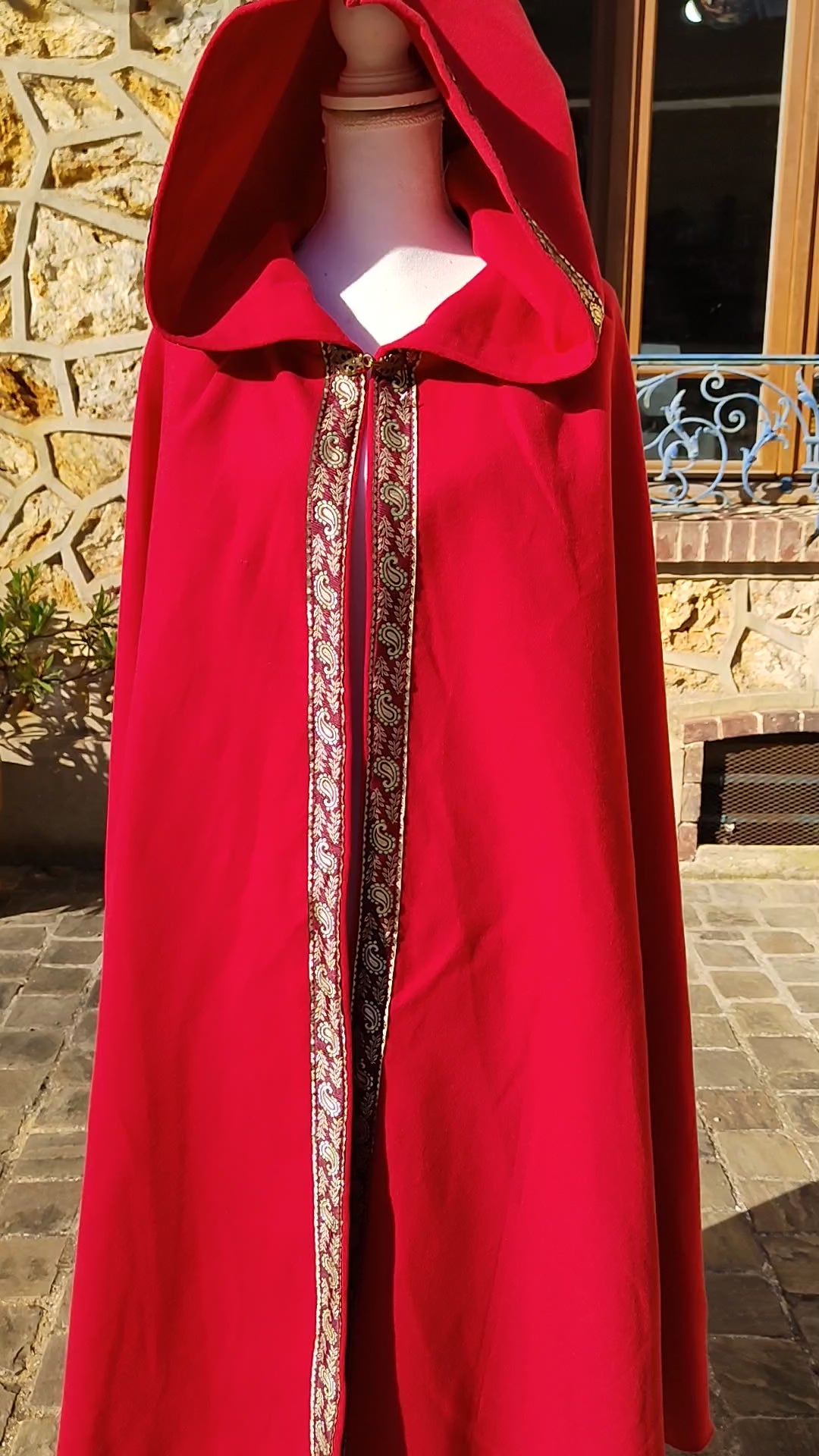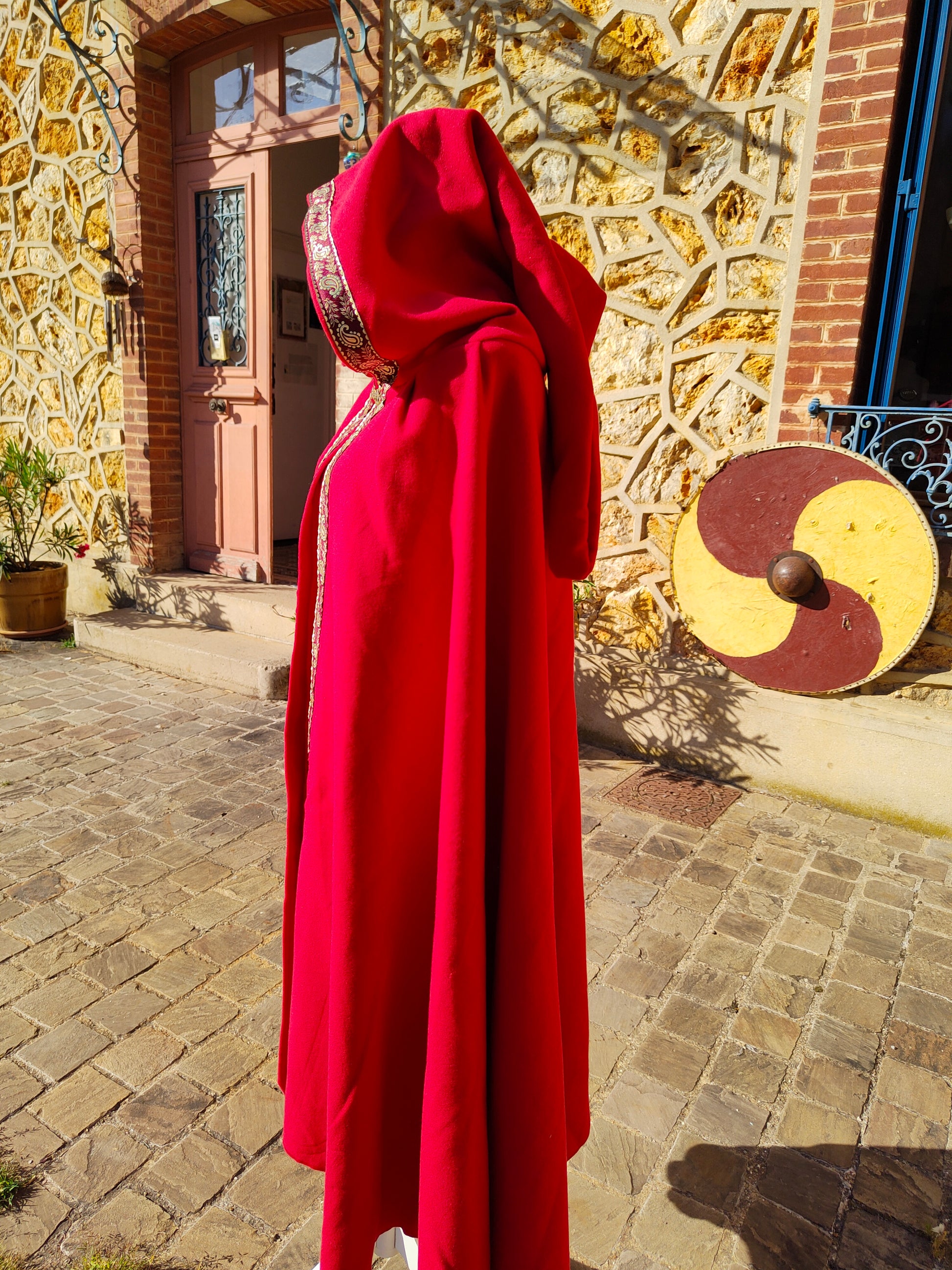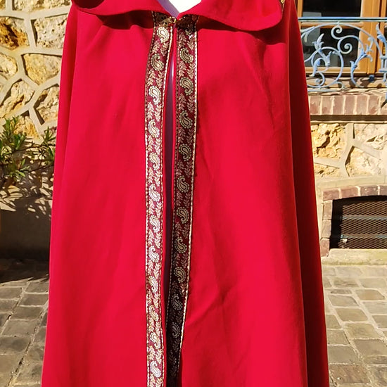Cape médiévale rouge en lainage avec galon avec entrelacs celtiques ou viking.